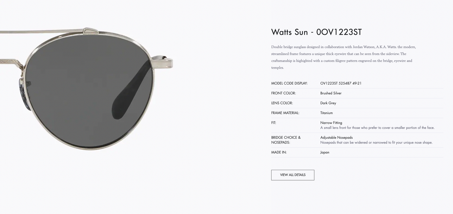 Double bridge sunglass designed in collaboration with Jordan Watson, A.K.A. Watts. the modern, streamlined frame features a unique thick eyewire that can be seen from the sideview. The craftsmanship is highighted with a custom filigree pattern engraved on the bridge, eyewire and temples.
