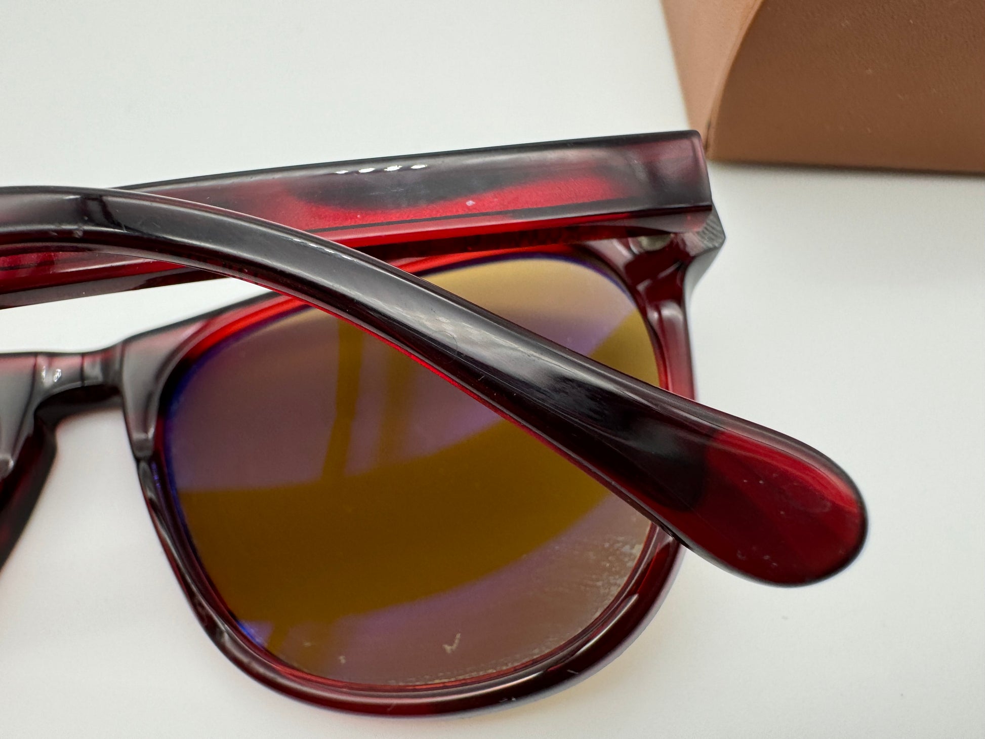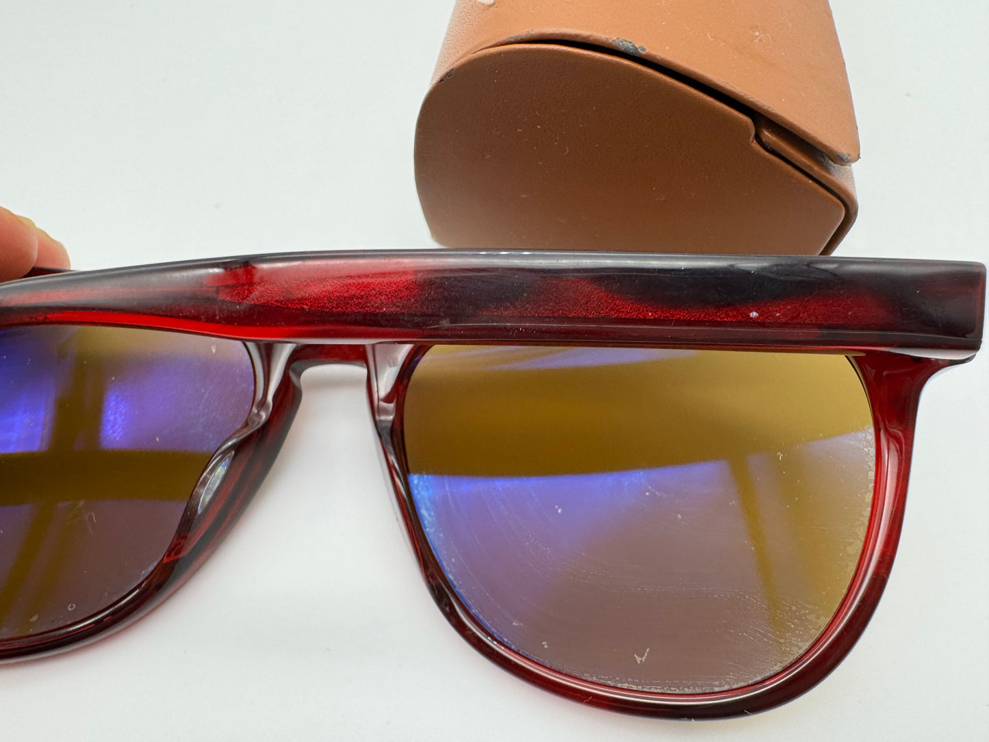 Frames are in preowned condition and the front around the key style bridge has some scuffs on it, lenses also have small dot marks these don't effect vision much see photos