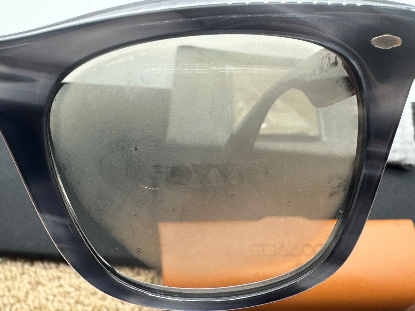 This beautiful pair of sunglasses Is in almost perfect condition. It is missing the original box and case in some packaging materials comes with everything shown in photos.